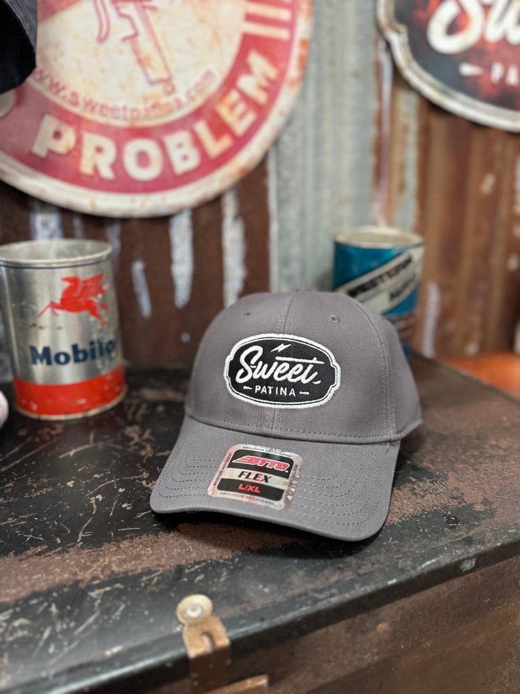 Charcoal Flexfit Fitted L/ XL Hats with embroidered Sweet Patina Bolt Logo